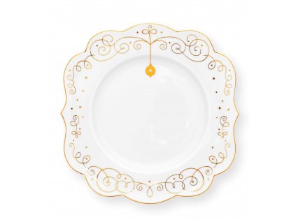 Bílý dezertní talíř se zlatým tvarovaným okrajem, k doplnění barevných kousků z kolekce Royal.