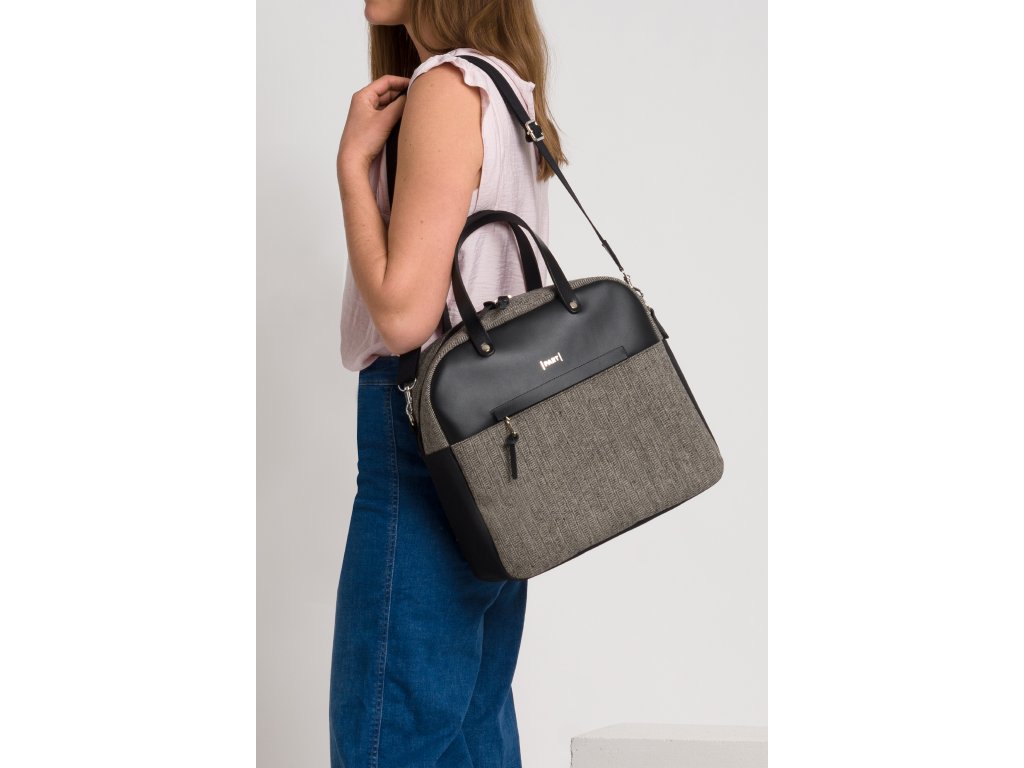 Kabelka pro každodenní nošení v kombinaci černé kůže a kvalitního vlněného tvídu je jako vystřižená ze stránek módního časopisu z šedesátek.