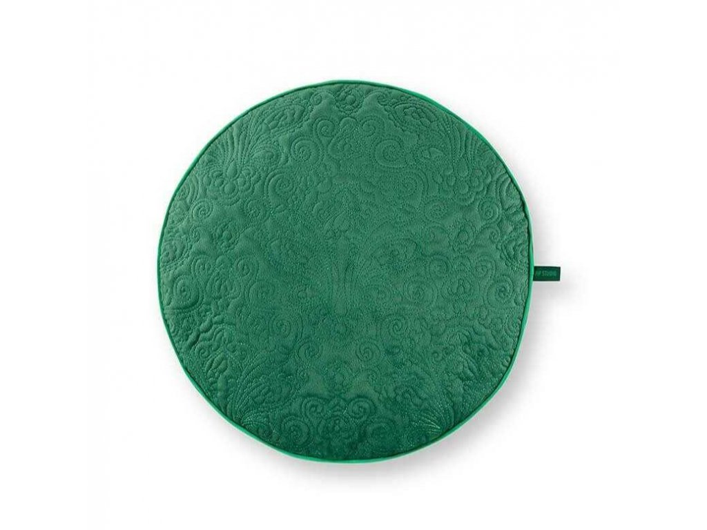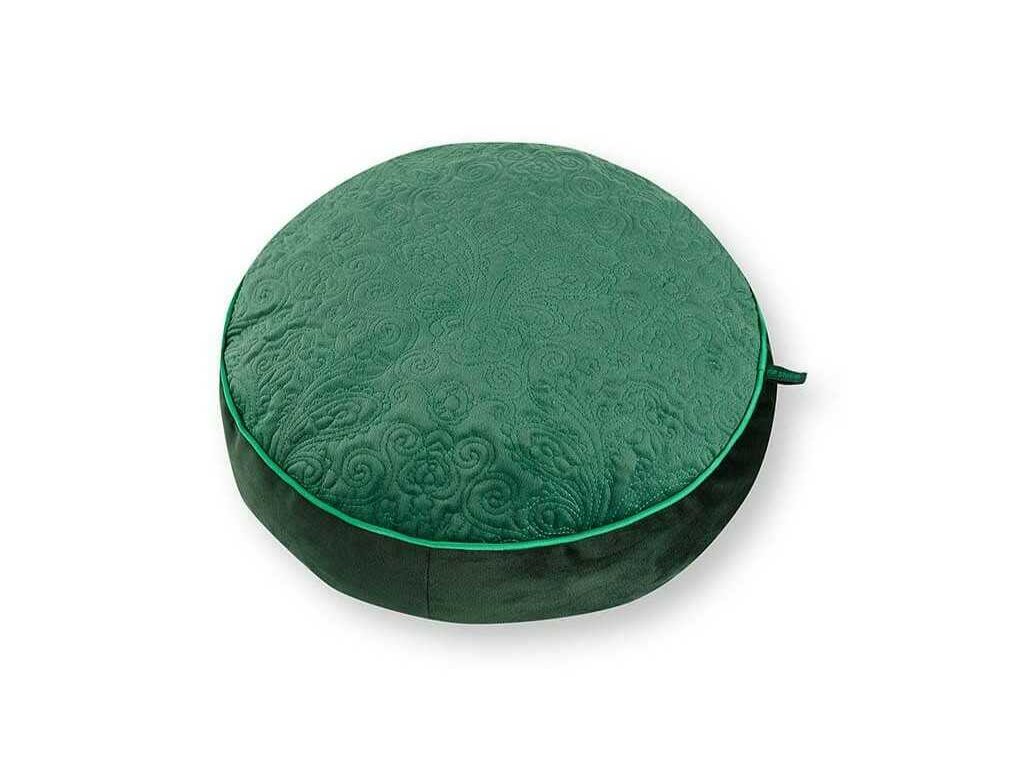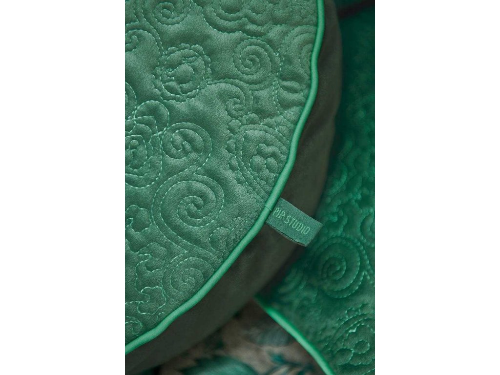 Kulatý sametový polštář v syté zelené barvě s prošíváním a z druhé strany dekor Suki - malé mušličky vyskládané jedna vedle druhé.
