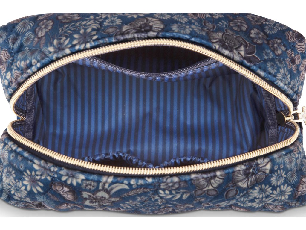 Středně velká kosmetická taštička z tmavě modrého sametu, s květinovým potiskem, které jí dodává luxusní vzhled. Zapíná se na zip, uvnitř má kapsičku na zip a dvě menší na gumičku . Ideální na cesty, vejde se do ní vše potřebné a podšívka je vyrobena z voděodolného materiálu. Na boku je všité pevné poutko na pověšení.