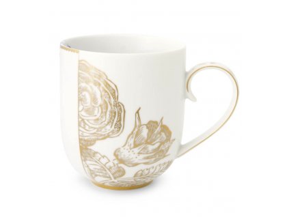 Kolekce Royal v bílé variantě, které dominují modré, ručně malované květy a zlaté puntíky a lemování.