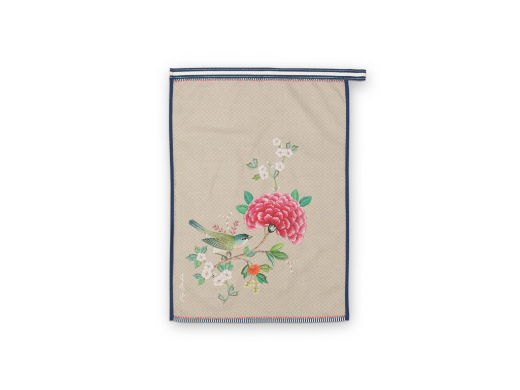 Krásná bavlněná utěrka z kolekce Blushing birds s růžolícím ptáčkem a pivoňkou, na béžovém podkladu s modrým lemováním a poutkem na pověšení. Skvěle doplní vaši kolekci porcelánu!